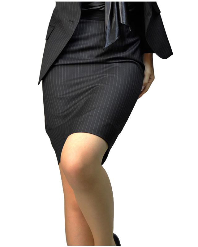 - Beautiful Italian Super100's Wool Pinstripes Suits featuring Peaked lapel, Flap pockets, Inner pocket, Single vent, Single breasted, One button Jacket and Single vent Pencil skirt. Model is 5'7" and wearing a size 4. You can specify your masurements for FREE length alterations. Inquire about it TODAY.